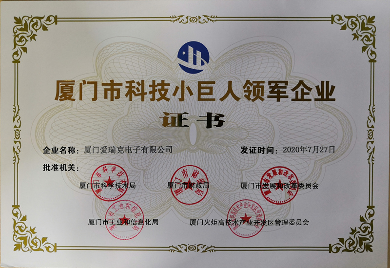 熱烈祝賀廈門(mén)愛(ài)瑞克電子有限公司在2020年7月27日獲得廈門(mén)市科技小巨人領(lǐng)軍企業(yè)證書(shū)